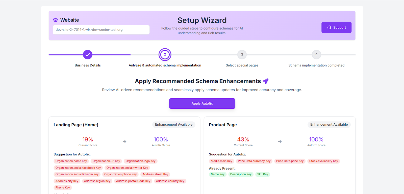Step 10: The tool will analyze your website and show schema improvements with the current and optimized scores. Click “Apply Autofix” to automatically apply the recommended schema enhancements.
