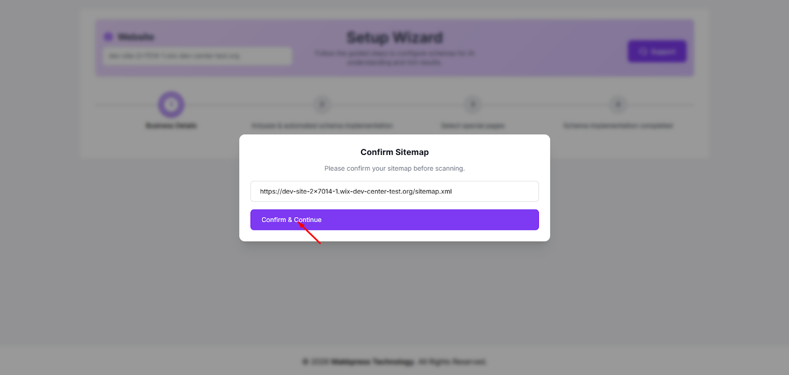 Step 9: Confirm your website sitemap URL to allow the tool to scan your pages. After confirming the URL, click “Confirm & Continue.”