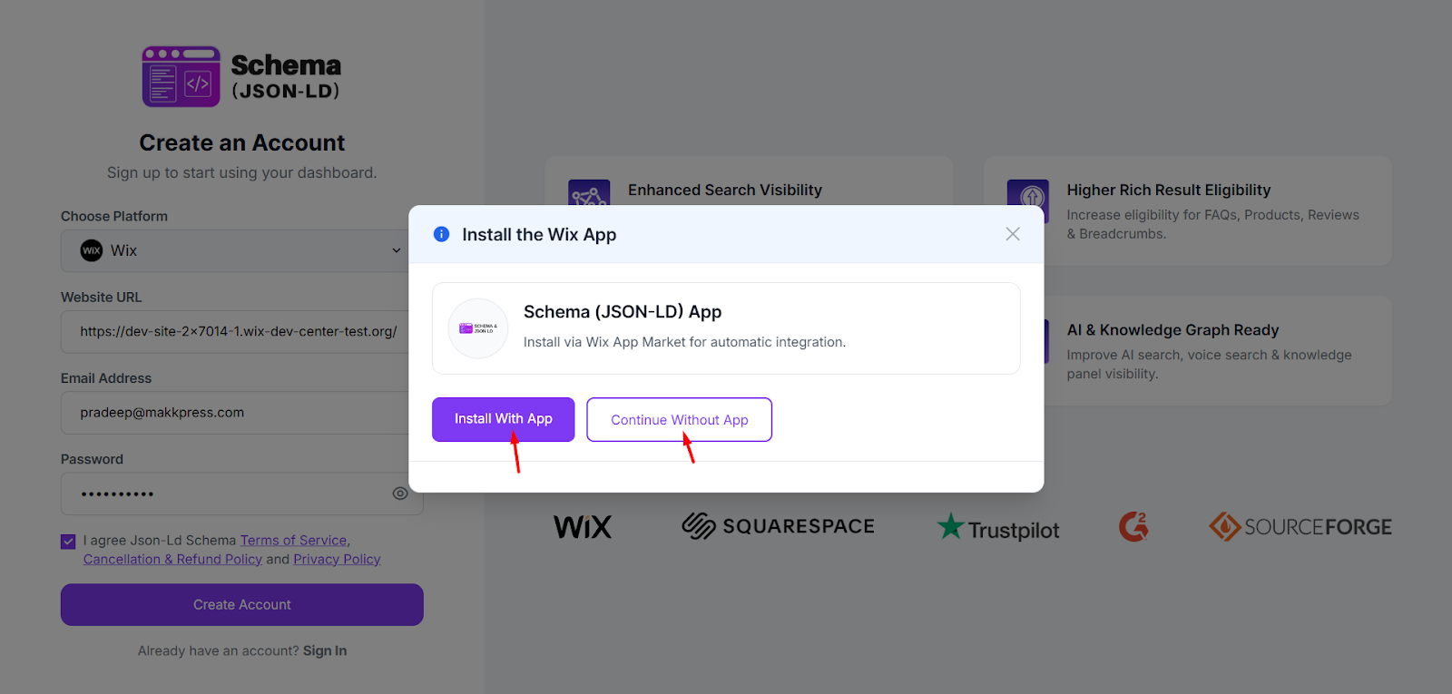 Step 3: After creating your account, a popup will appear asking to install the Wix app. Click “Continue Without App” to install the Schema tool directly from the website.