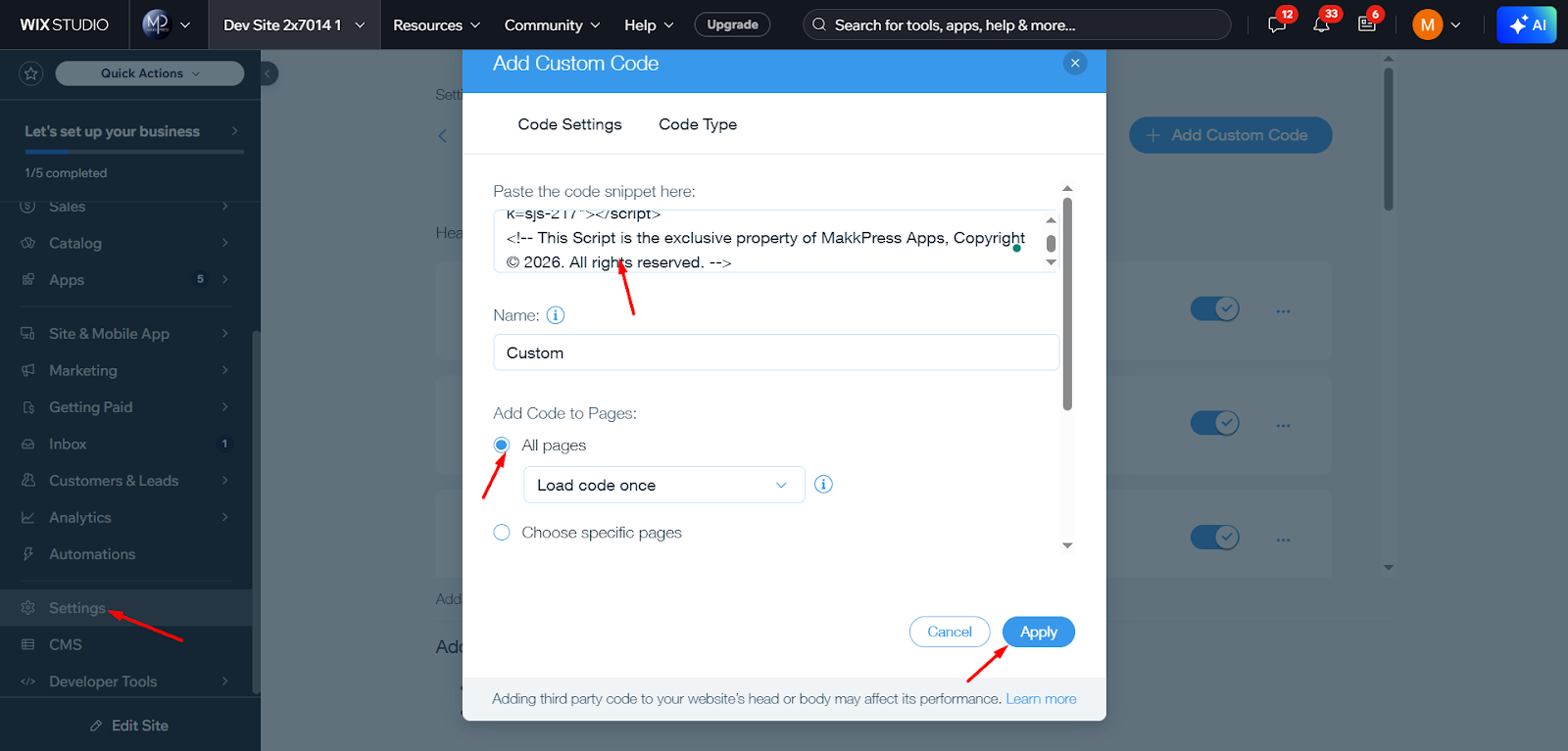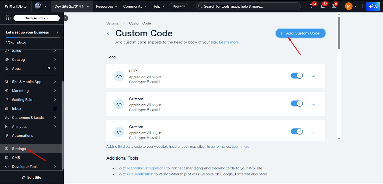Step 6: Go to Settings → Custom Code in your Wix dashboard, then click “Add Custom Code”.