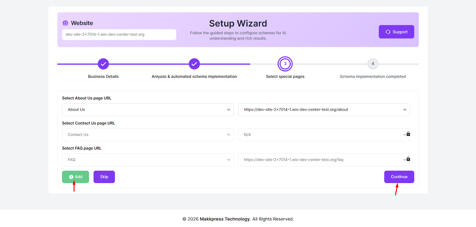 Step 11: Select the URLs for important pages such as About Us, Contact Us, and FAQ from the dropdown menus. If needed, you can add more pages by clicking Add. Once selected, click “Continue” to proceed to the final step.