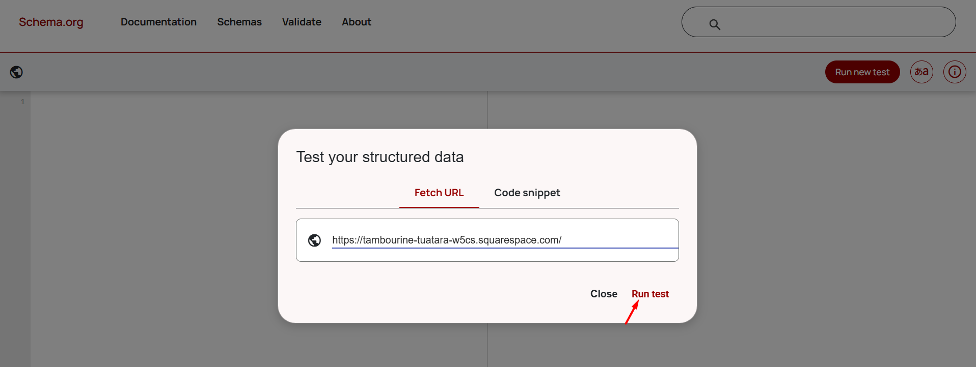 Step 1: Open Schema Markup Validator, enter your page URL in the input field, and click Run test to start validation.