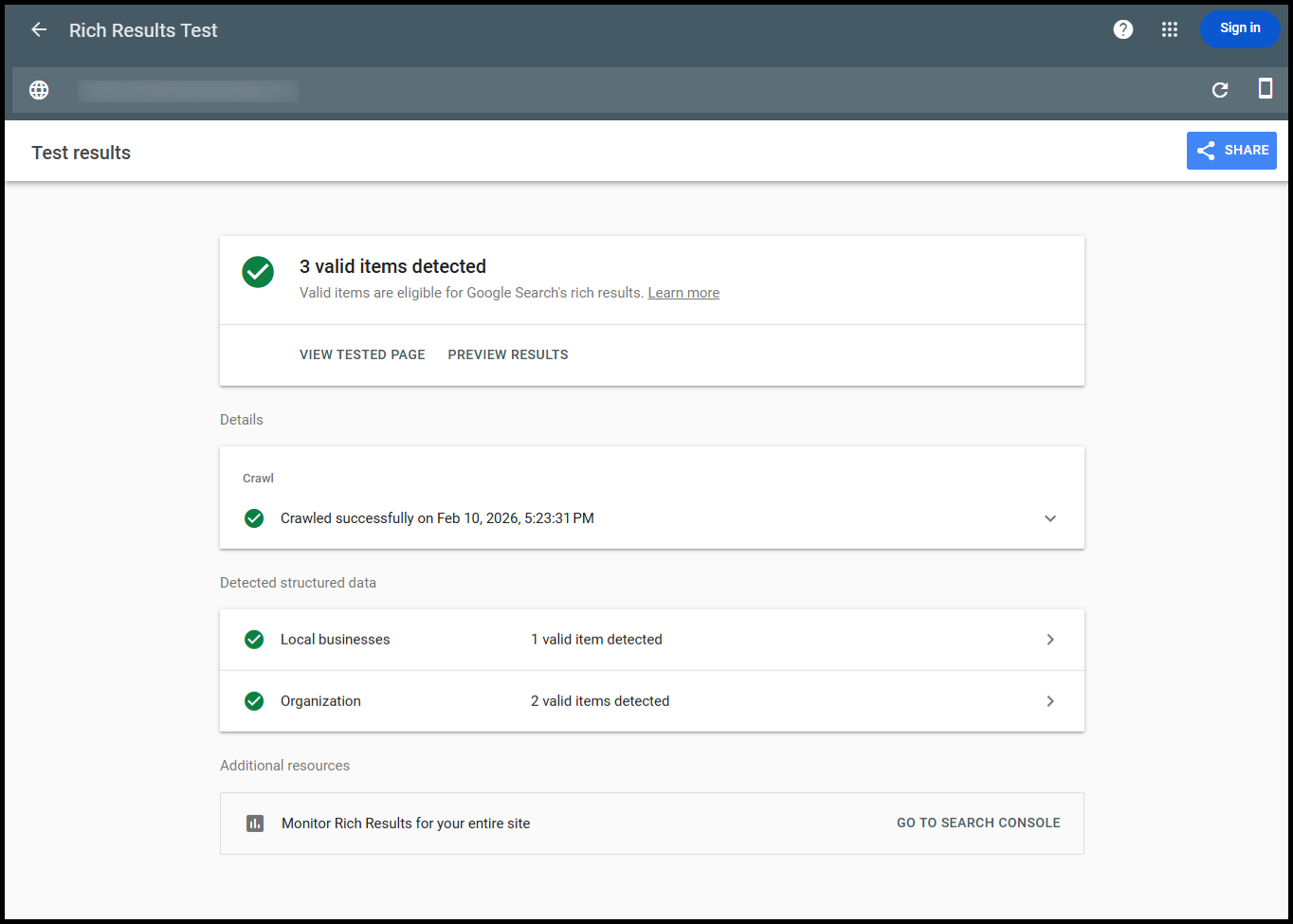 Step 2: You will see the test results showing valid items detected, including schema types like LocalBusiness and Organization, along with their validation status.