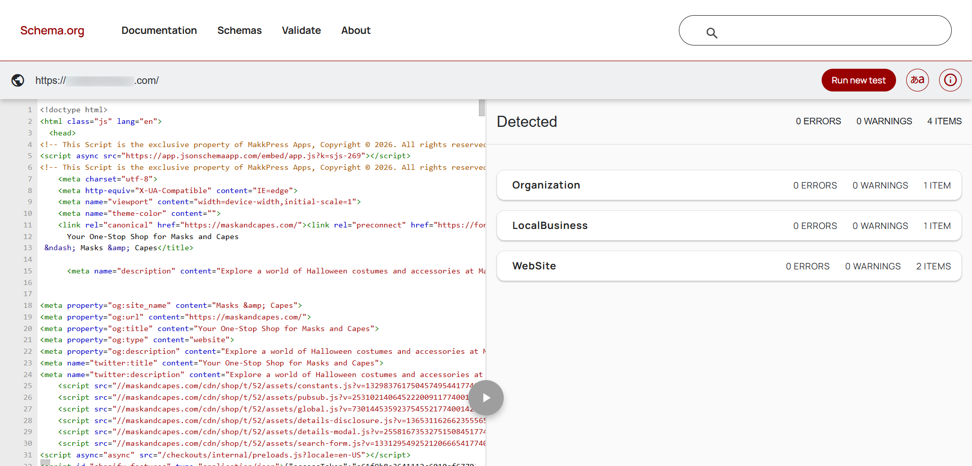 Step 2: After the test runs, you will see the detected schema types, such as LocalBusiness and Website, along with their validation status and any errors or warnings.
