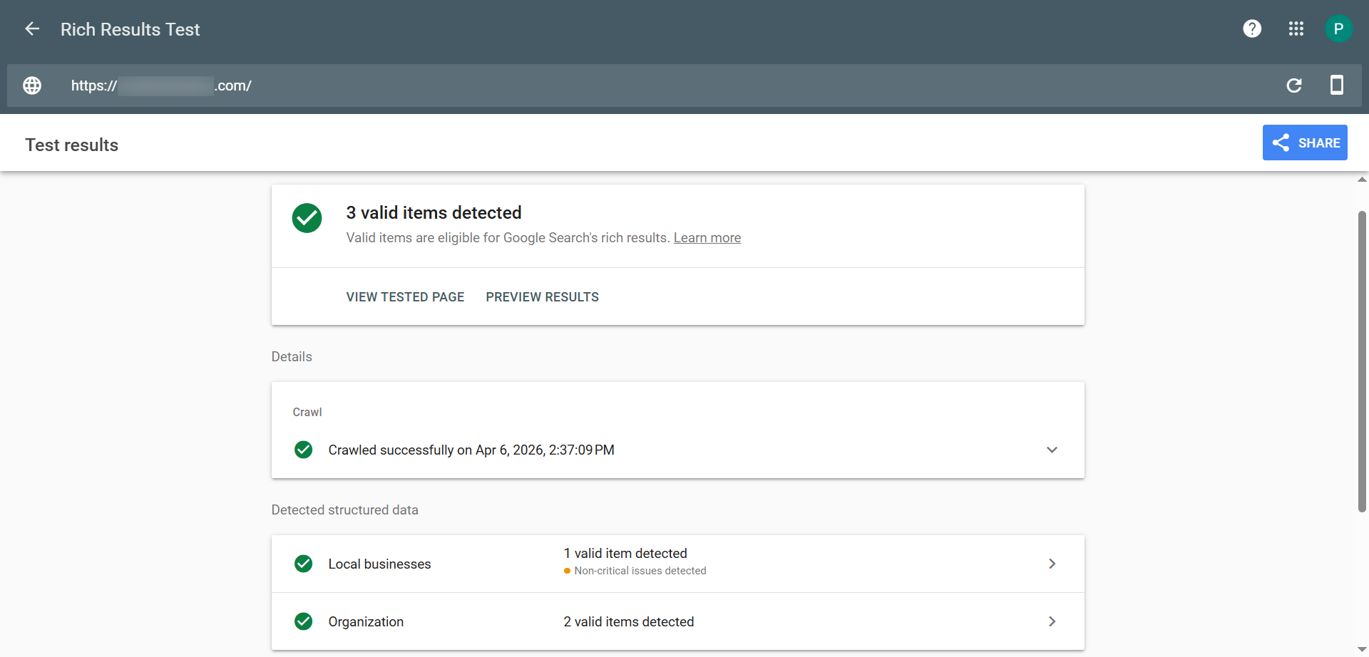 Step 2: You will see the test results showing valid items detected, including schema types like LocalBusiness and Organization, along with their validation status.